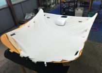 まず、既存の天井生地を剥がし、残った粉状のウレタンを全面にわたり丁寧に除去。この工程を疎かにすると再発の原因になるため、最も重要な下地処理です。