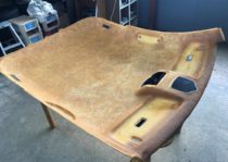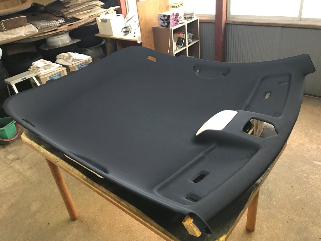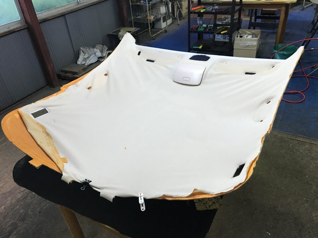 施工中写真では、天井ライナーが車両から取り外され、作業台の上で処理されている様子が確認できます。