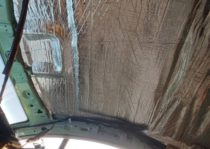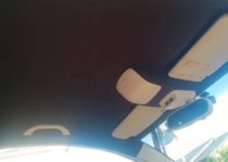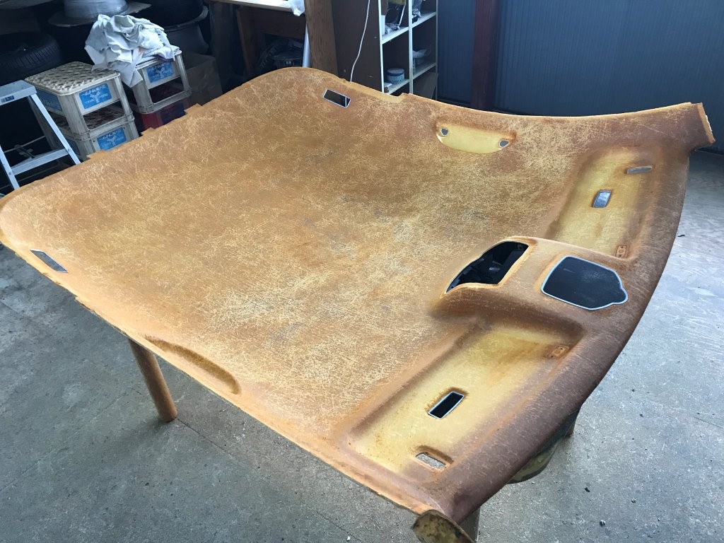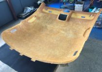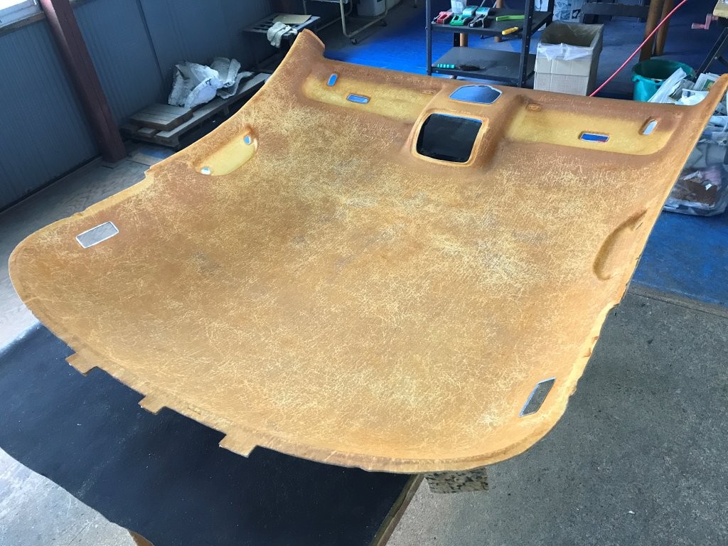 施工前写真では、天井ライナー全面にわたり生地が支えを失い、中央部を中心に大きく垂れ下がっている状態が確認できます。