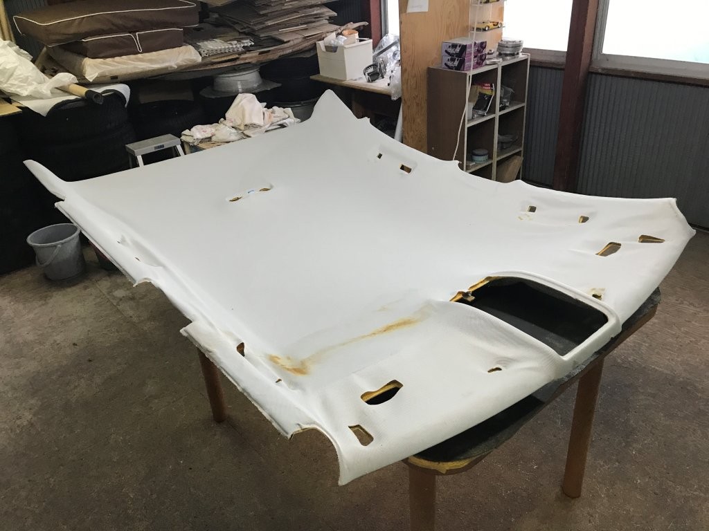 取り外したライナーから劣化した天井生地を剥がします。写真の通り、裏側には劣化したウレタンが残っており、触るだけで崩れる状態でした。