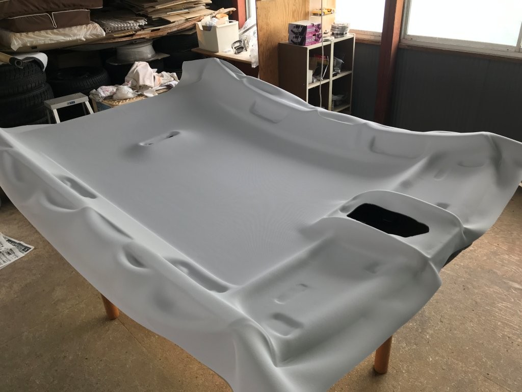 下地を整えたライナーに新しい天井生地を均一に接着していきます。